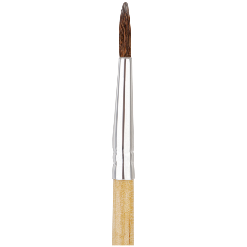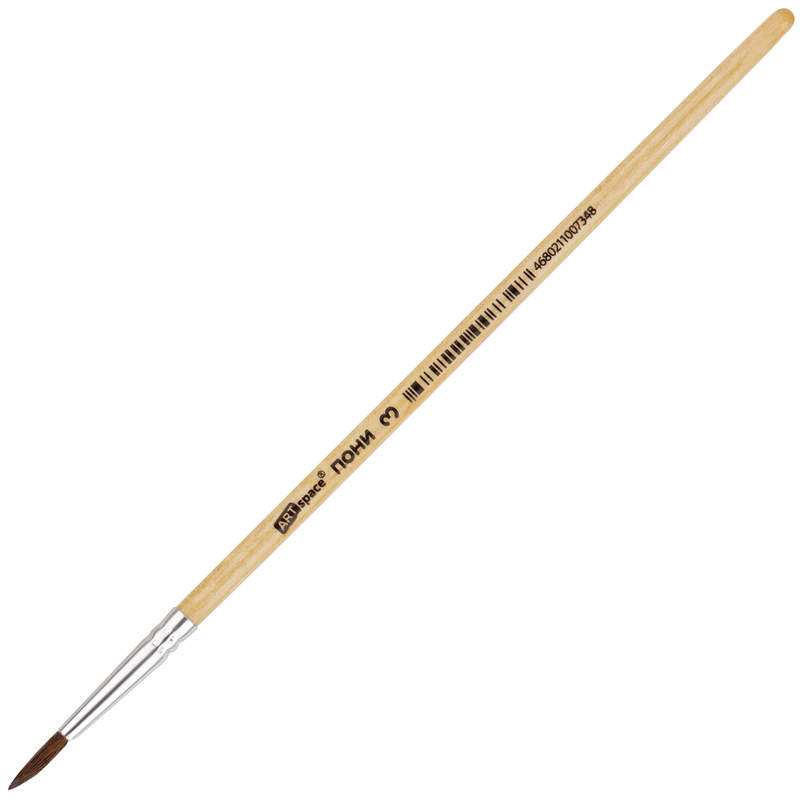 Художественные кисти ArtSpace изготовлены из волоса пони. Он несколько толще, чем у белки, расстояние между волосками больше, поэтому воду такая кисточка набирает меньше, чем из белки или колонка. Приобретают форму конуса, не слишком упруги. Кисть круглой формы с короткой ручкой из дерева идеальна для начинающих художников, поэтому её часто используют в детских образовательных учреждениях.