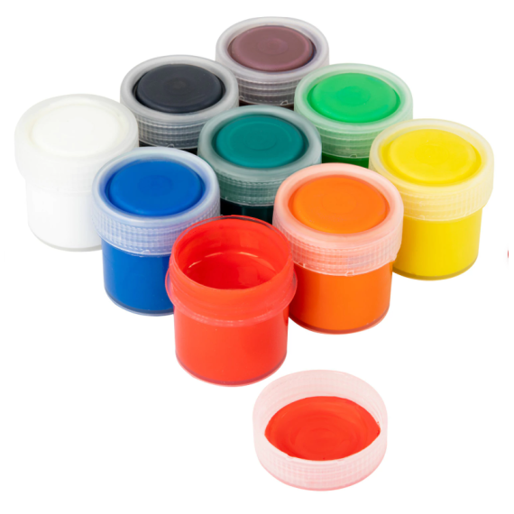 Разбавляются водой (не больше 10% от объема баночки). Обладают высокой кроющей способностью. 9 ярких и насыщенных цветов: белый, желтый, красный, зеленый, синий, черный, желто-зеленый, оранжевый, коричневый.