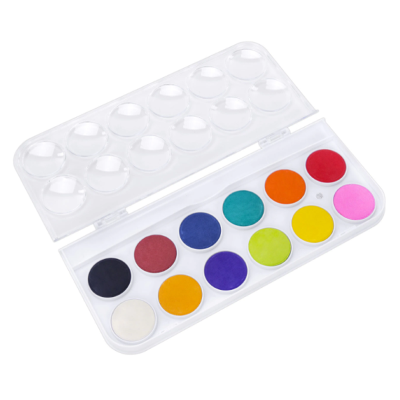В наборе 12 насыщенных цветов, которые отлично смешиваются, позволяя создавать множество оттенков. Краски легко наносятся, образуя интенсивное яркое покрытие даже при нанесении в один слой. Обеспечивают однородное окрашивание, быстро высыхают и не портятся со временем. Краски безопасны для детей, нетоксичны. Выпускаются в пластиковом пенале с европодвесом, прозрачной крышкой, круглой формой кювет и отделением для кисточки. Съемную пластиковую крышку можно использовать в качестве палитры для смешивания красок.
