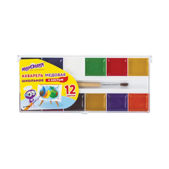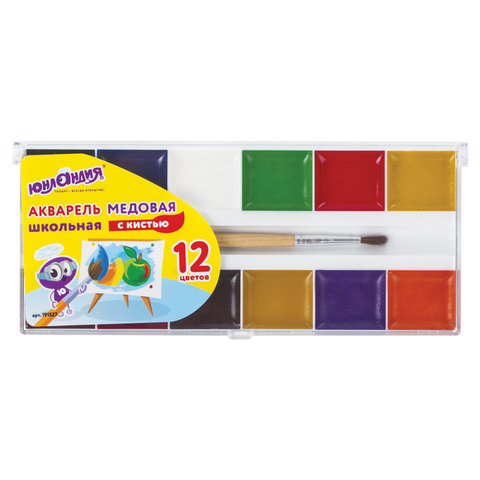 Краски акварельные ЮНЛАНДИЯ "ШКОЛЬНЫЕ", 12 цветов, медовые, увеличенный объем кювет, С КИСТЬЮ, пласт