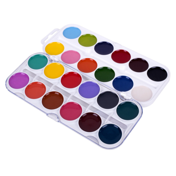 24 ярких насыщенных цвета отлично смешиваются между собой и позволяют создать множество оттенков, обеспечивают однородное окрашивание. Краски быстро высыхают и не портятся со временем. Безопасны для детей, нетоксичны. Выпускаются в пластиковом пенале с прозрачной крышкой, круглой формой кювет и отделением для кисточки. Упаковка обладает компактными размерами за счет того, что имеет два яруса красок по 12 кювет в каждом. Верхний ярус с красками съемный.