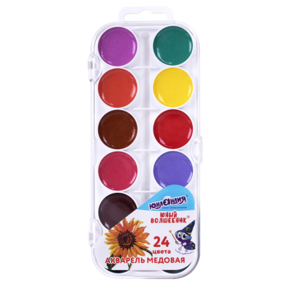 Краски акварельные ЮНЛАНДИЯ "ЮНЫЙ ВОЛШЕБНИК", медовые, 24 цвета, круглые кюветы, пластик