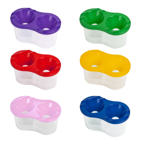 Стакан выполнен из прочного пластика и имеет 2 вместительных резервуара для воды. Линия на прозрачном корпусе указывает на максимально возможный уровень наполнения. Специальная форма крышки стакана исключает возможность вытекания воды. На крышке имеются углубления для размещения кисточек. Полный объем одного отделения - 150 мл. Объем до уровня наполнения - 50 мл.