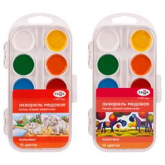 Медовая акварель серии "Мультики" разработана с учетом рекомендаций педагогов. Идеально подходит для занятий рисованием в детском саду, школе и дома. Яркие чистые цвета развивают фантазию и интерес к творчеству. Акварель безопасна для детей. Удобный пластиковый пенал, крышка плотно фиксируется и служит палитрой для смешивания красок. Кюветы с высокими бортиками и увеличенным расстоянием между красками предназначены для удобства в работе детей. Акварель легко смывается с рук и отстирывается с одежды. Объем кювет - 3,5 см3. Форма кювет - круглая.