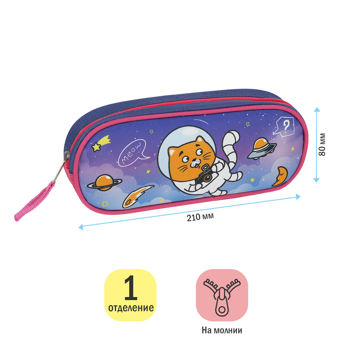 Пенал-футляр для девочки ArtSpace CosmoCat – отличный помощник в учёбе. Изделие размера 210*80*45 мм имеет одно отделение, закрывающееся на молнию. Модель выполнена из полиэстера. Удобный и яркий школьный пенал для хранения письменных и чертежных принадлежностей непременно понравится девочкам. Упакован в индивидуальный пакет. Поставляется без наполнения.