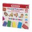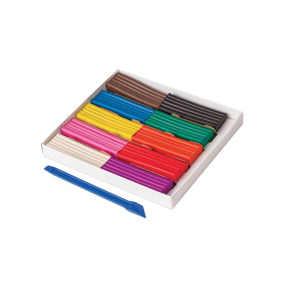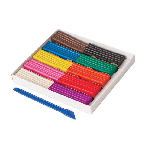 В наборе представлены 10 цветов: белый, желтый, оранжевый, розовый, красный, зеленый, синий, сиреневый, коричневый, черный. Масса набора - 200 г. Поставляется в комплекте со стеком, с помощью которого ребенок может разделять пластилин на части или наносить орнамент на свои поделки.