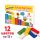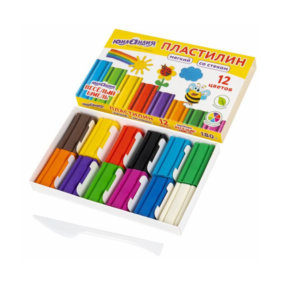 В составе набора 12 цветов: белый, черный, синий, красный, желтый, зеленый, коричневый, оранжевый, голубой, светло-зеленый, фиолетовый, лиловый. Масса набора - 180 г. Поставляется в комплекте со стеком, с помощью которого ребенок может разделять пластилин на части или наносить орнамент на свои поделки.