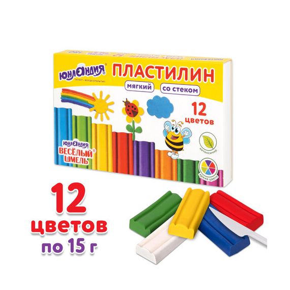 Пластилин мягкий ЮНЛАНДИЯ "ВЕСЕЛЫЙ ШМЕЛЬ", 12 цветов, 180 г, СО СТЕКОМ