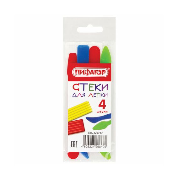 В наборе ПИФАГОР 4 стека для лепки разного вида, назначения и цветов (красный, зеленый, синий). Наконечники стеков имеют самую разнообразную форму: плоскую, треугольную, остроугольную, закругленную, круглую. Предназначен для работы с пластилином, полимерной и любой другой глиной, а также с гипсом и прочими формующимися пластиками. Набор упакован в пакет с европодвесом.