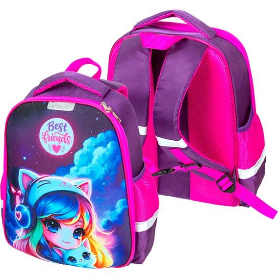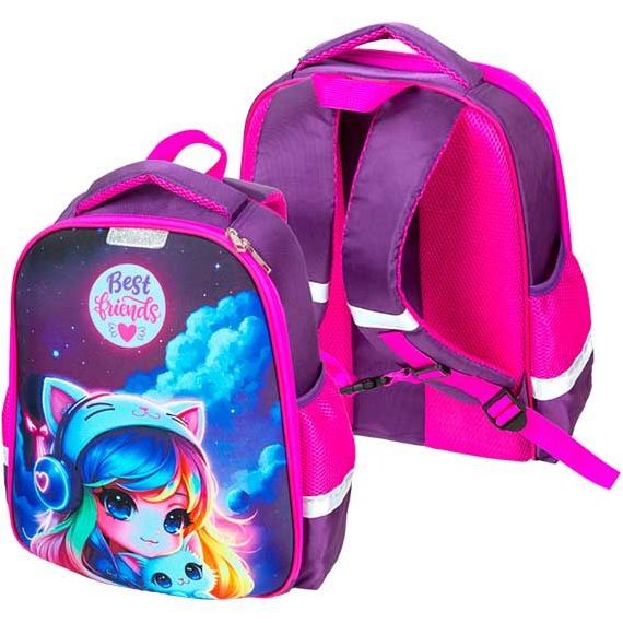 Рюкзак "Attomex. Optima. Best Friends" школьный жесткий 37x28x18 см (17 л) вес 700 г, плотный износостойкий полиэстер с водоотталкивающей пропиткой, 1 отделение на молнии с разделителями для учебников c фиксатором на липучке, 2 боковых кармана сеткой на резинке, эргономичная формоустойчивая вентилируемая спинка и мягкие S-образные лямки, дно из фактурной резины, уплотненная ручка для переноски и петля для повеса, светоотражающие элементы, полноцветная печать