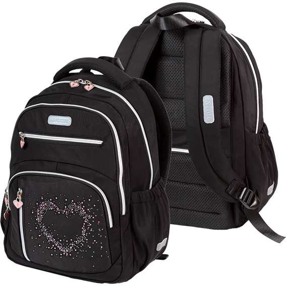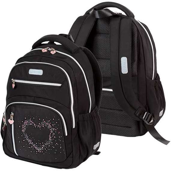 Рюкзак "deVENTE. Zoom. My Heart" школьный 38x30x19 см (16 л) 550 г, плотный износостойкий полиэстер с водоотталкивающей пропиткой, 1 отделение на молнии с уплотненным отделением для ноутбука до 15 дюймов и книг, 1 переднее отделение на молнии, 3 передних кармана на молнии, 2 боковых кармана, вентилируемая спинка с потайным карманом на молнии и вентилируемые лямки, уплотненная ручка для переноски и петля для повеса, светоотражающие элементы, молния с декором, крепление для ключей внутри, черный