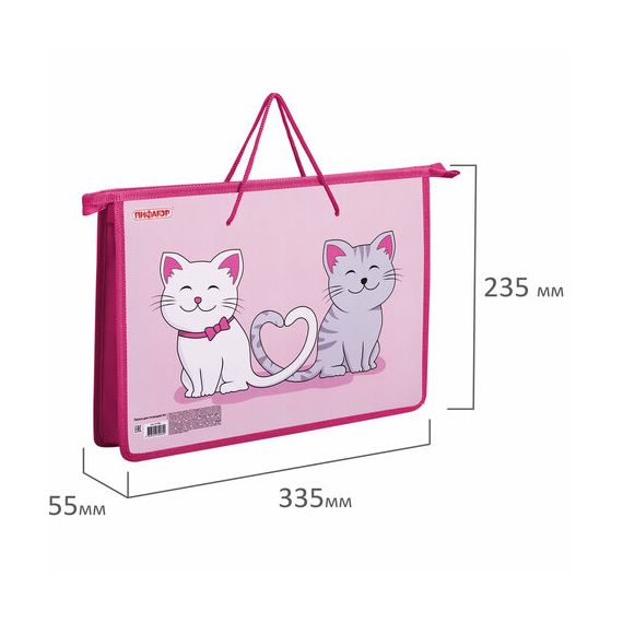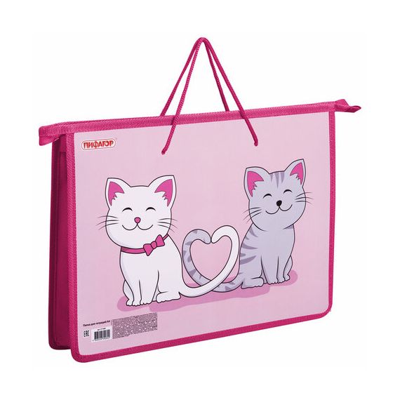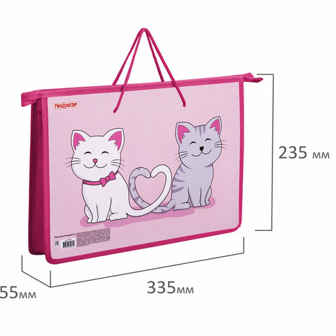 Папка на молнии с ручками ПИФАГОР формата А4 выполнена из пластика, по краям имеет тканевую окантовку. Одно отделение. Застежка-молния расположена по верхнему краю папки. Цветная печать.