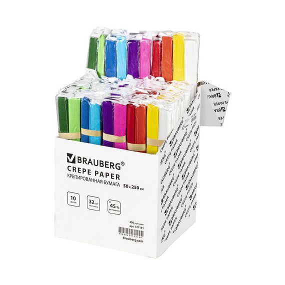 Благодаря своей высокой плотности 32 г/м2 и удлинению при натяжении на 45%, крепированная бумага позволяет создавать объемные композиции, которые надолго сохранят задуманную форму. Размер рулона — 50×250 см. Продается в картонном дисплее ассорти - в упаковке 200 рулонов бумаги 10 разных цветов. Это позволяет экономить время при изготовлении большого количества различных поделок - купив один раз большой набор ассорти, его хватит надолго и каждая поделка будет уникальной. Также такая упаковка удобна для продажи в розницу.
