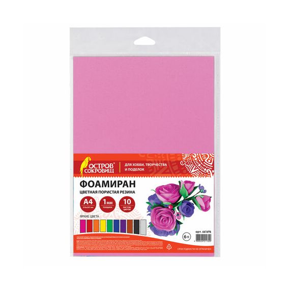 Пористая резина/фоамиран А4, 1 мм, ОСТРОВ СОКРОВИЩ, 10 листов, 10 цветов, яркие цвета