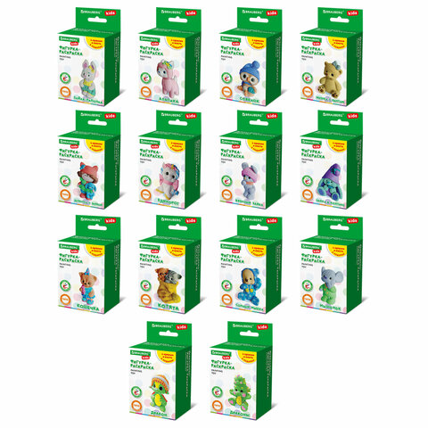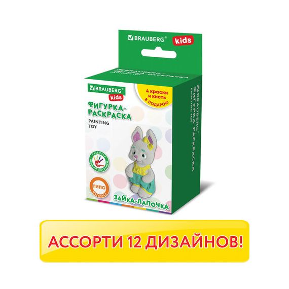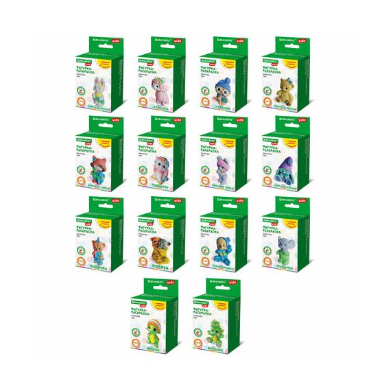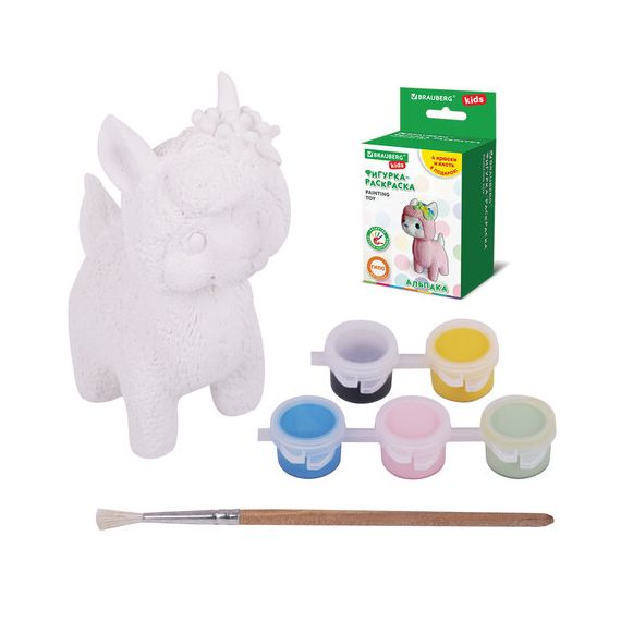 В набор фигурки для росписи BRAUBERG KIDS входят белая гипсовая фигурка, 5 гуашевых красок, кисточка, коробка с примером раскрашивания. Сочетания цветов для каждой фигурки были подобраны профессиональными художниками. Цвета красок внутри коробки соответствуют цветам, в которые раскрашена фигурка на фото упаковки.