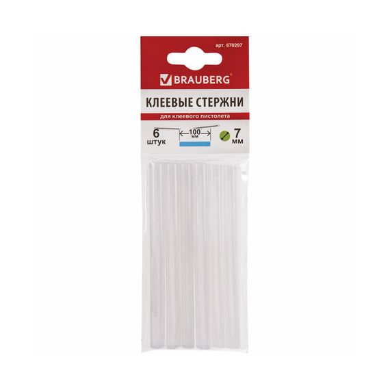 Клеевые стержни, диаметр 7 мм, длина 100 мм, белые, комплект 6 штук, BRAUBERG, европодвес, 670297
