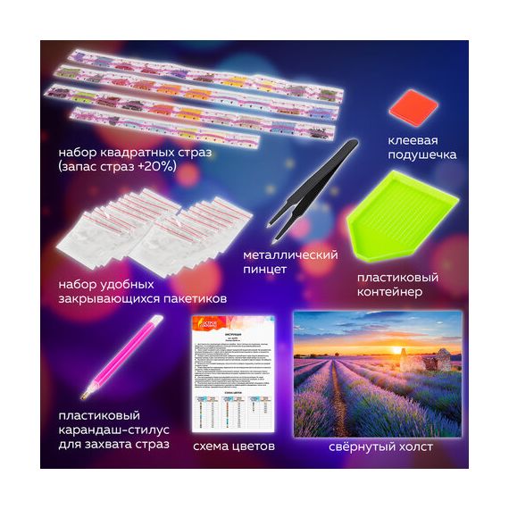 Техника алмазной мозаики проста в исполнении и не требует владения никакими специальными навыками. Все необходимые для работы материалы и инструменты входят в набор, подробная инструкция находится внутри упаковки.