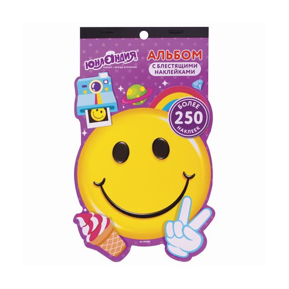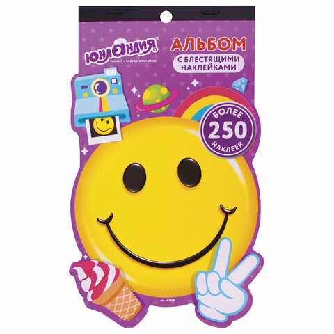 Альбом со сверкающими наклейками "Смайлики", 4 листа, более 250 шт., склейка, ЮНЛАНДИЯ