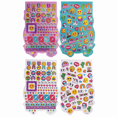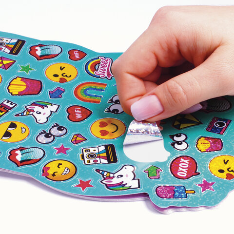 Альбом из 4 фигурных листов на склейке содержит более 250 разных наклеек со смайликами, выражающими самые разные эмоции и чувства. В альбоме 2 листа с яркими, красочными наклейками и 2 листа со сверкающими, переливающимися наклейками, которые можно использовать для украшения тетрадей, дневника, блокнотов, а также для создания аппликаций и поделок.