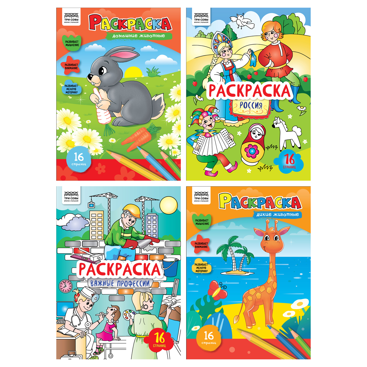 Раскраска ТРИ СОВЫ «Любимая раскраска» формата А4 (205*285 мм) – это не только интересное, но и полезное занятие для ребенка. Внутренний блок состоит из 16 страниц офсетной бумаги, которая подходит для раскрашивания карандашам, фломастерами или красками. В запайке 4 разных раскраски на темы: «Домашние животные», «Дикие животные», «Важные профессии», «Россия». Задача ребенка раскрасить разными цветами чёрно-белое изображение, не выходя за контуры. Благодаря этому занятию малыш учится правильно держать ручку, различать цвета и их оттенки. Раскраски помогают развить усидчивость и аккуратность, а также фантазию и воображение.