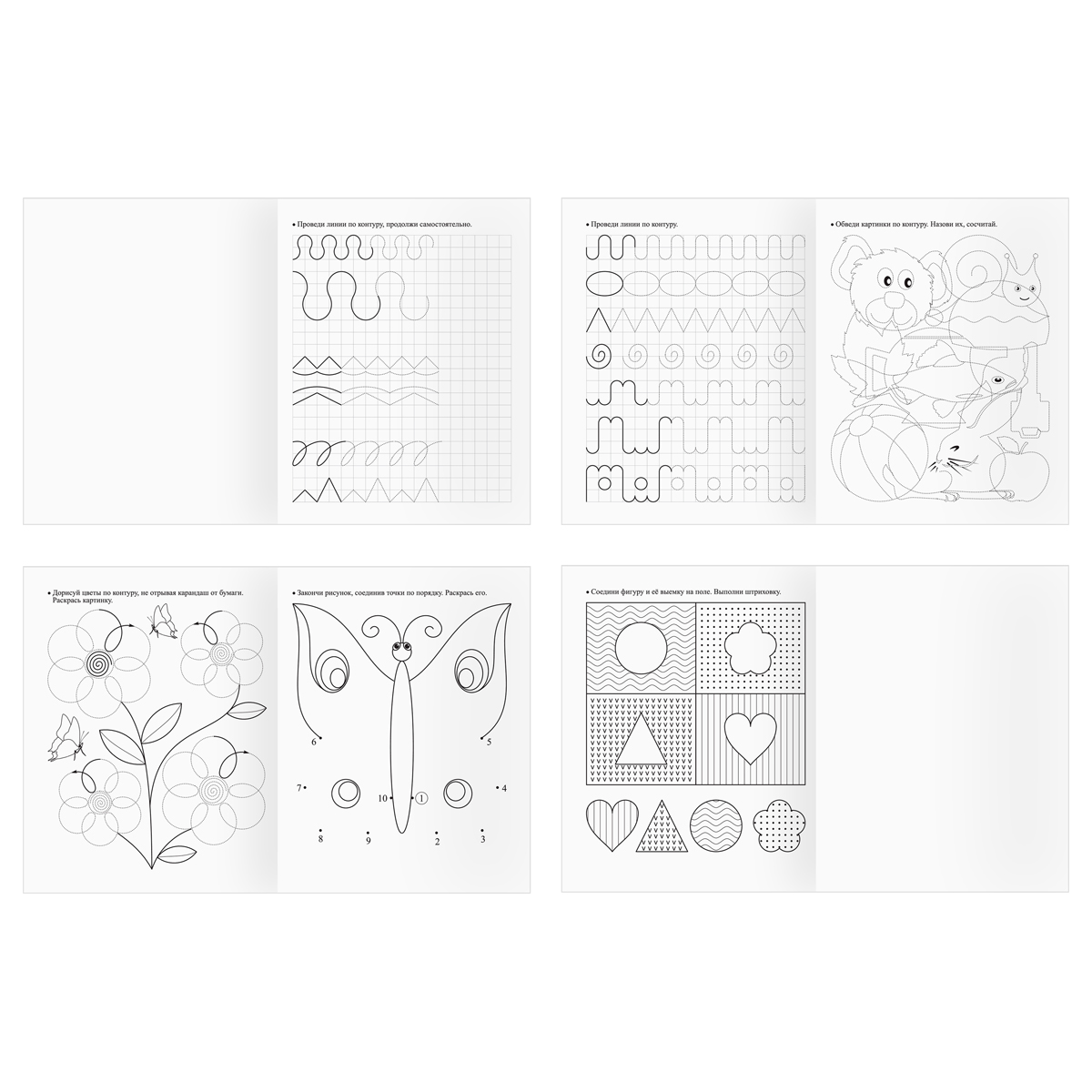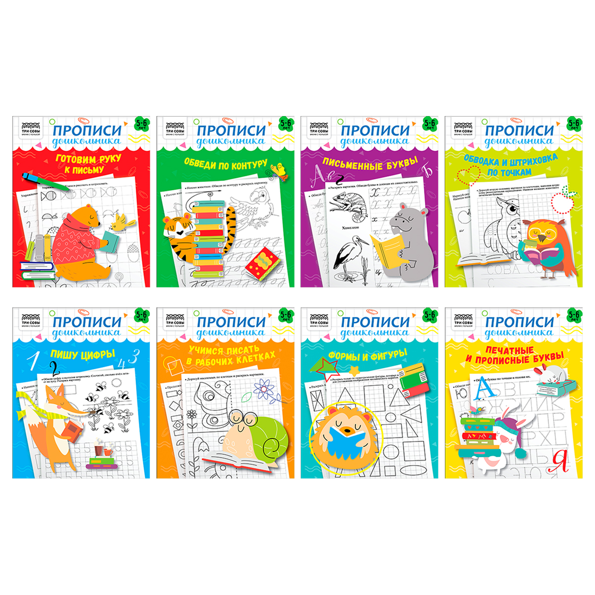 В серии «Прописи дошкольника» представлены в запайке восемь прописи для детей возраста 5-6 лет на следующие темы: «Готовим руку к письму», «Обведи по контуру», «Обводка и штриховка по точкам», «Печатные и письменные буквы», «Письменные буквы», «Пишу цифры», «Учимся писать в рабочих клетках», «Формы и фигуры».