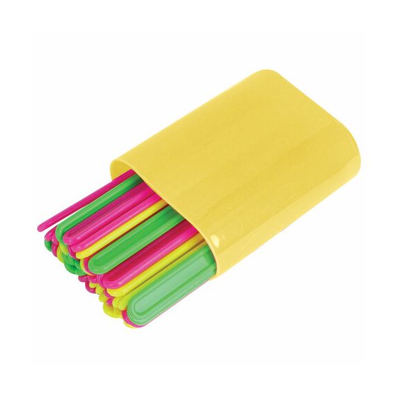 Набор содержит 50 пластиковых палочек с закругленными краями 5-ти ярких цветов ассорти (без возможности выбора). Палочки помещены в пластиковый футляр желтого цвета. Размер футляра - 80х40х20 мм.
