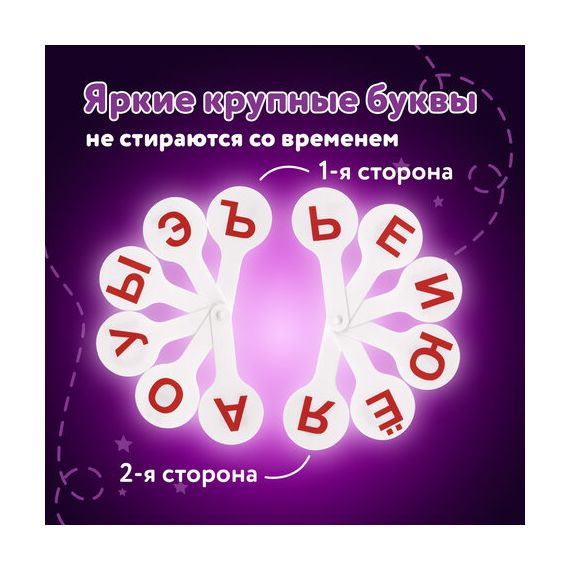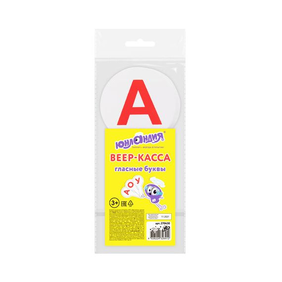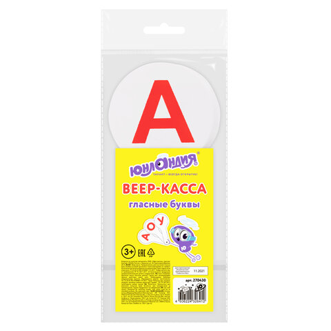Набор содержит 1 веер с гласными буквами русского алфавита. Символы нанесены с двух сторон. Крупный размер и шрифт, качественная печать, устойчив к истиранию. Изготовлен из сертифицированного полипропилена. Размер в индивидуальной упаковке- 190х80х15 мм. Поставляется в пакете с европодвесом.