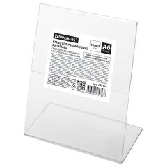 Устойчивая практичная конструкция изготовлена из прозрачного акрилового стекла толщиной 1 мм. Имеет размер 105х150 мм. Максимальная толщина вставки составляет 1,5 мм, глубина основания держателя информации - 52 мм, ширина ножки - 1 мм. Идеально подходит для формата А6.