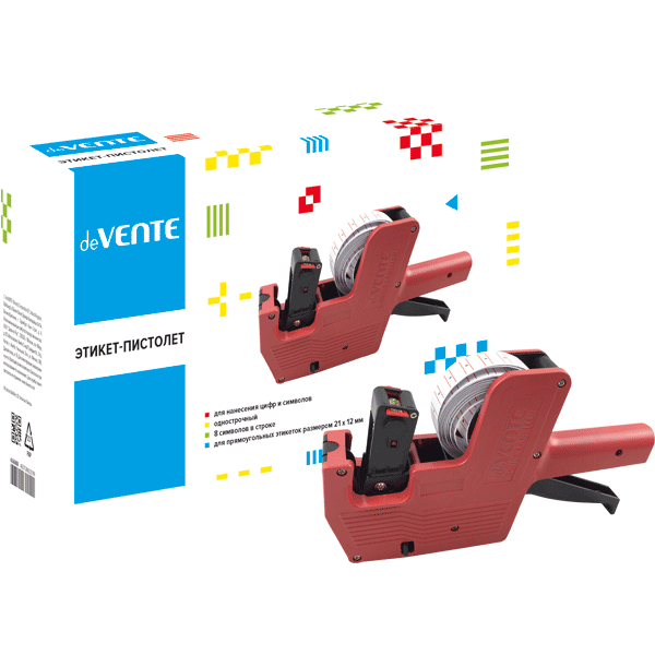 Этикет-пистолет "deVENTE" 1-строчный, 8 символов, для прямоугольных этикеток 21x12 мм, красный цвет корпуса
