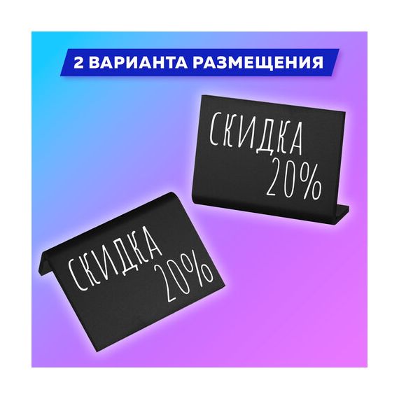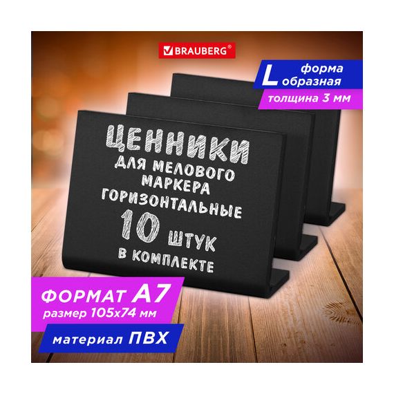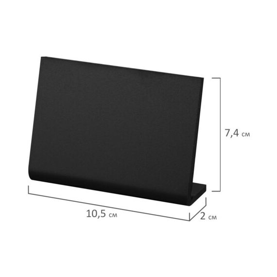 Ценники меловые A7 (7,4x10,5 см), комплект из 10 шт. L-образная форма не требует отдельного держателя, наклейки или подставки – ценник легко расположить на любой горизонтальной поверхности. Материал ценника – ПВХ черного цвета, толщина 3 мм. Упаковка комплекта – термоусадочная пленка.