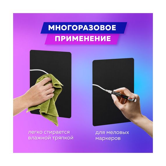 Для нанесения информации необходимо использовать меловые маркеры. Рекомендуем использовать слегка влажную тканую салфетку (например, из микрофибры) для качественного и бережного удаления записей и долговременного использования поверхности.