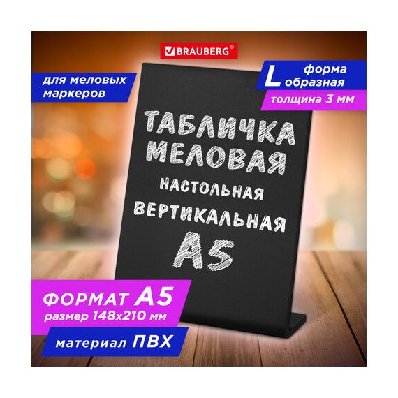 Табличка меловая настольная А5 (14,8x21 см), L-образная, вертикальная, ПВХ, ЧЕРНАЯ, BRAUBERG, 291293