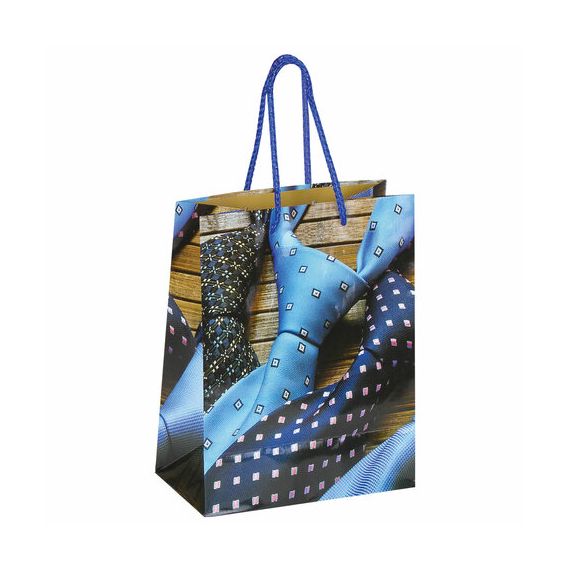 Изготовлен из ламинированной мелованной бумаги с веревочными ручками из полипропилена. Размер 18x10x23 см. Пакет выполнен в коричневых, синих и голубых тонах с изображением галстуков.