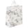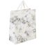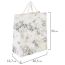 Изготовлен из ламинированного мелованного картона с ленточным ручками из полиэстера. Размер - 26x13x33 см. Пакет выполнен в цвете белого мрамора с изображением абстракции. С лицевой стороны пакета некоторые детали покрыты тиснением золотистой фольгой.