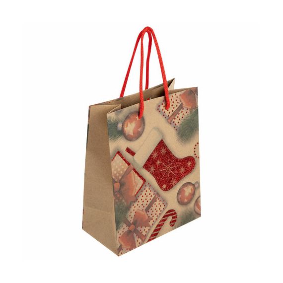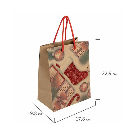 Изготовлен из крафтовой бумаги с веревочными ручками из полипропилена. Размер - 18x10x23 см. Пакет выполнен в красном цвете с изображением праздничных новогодних атрибутов. С лицевой стороны пакета некоторые детали выделены глиттером.