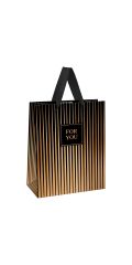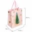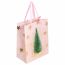 Изготовлен из ламинированного мелованного картона с ленточными ручками из полиэстера. Размер - 18x10x23 см. Пакет выполнен в розовом и золотистом цветах с изображением праздничных новогодних атрибутов. С лицевой стороны пакета некоторые детали покрыты тиснением золотистой фольгой.