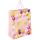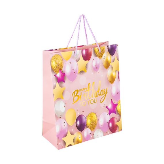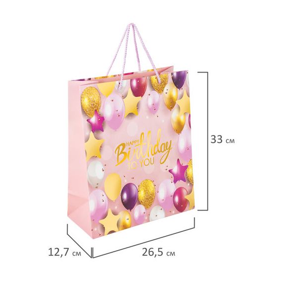 Изготовлен из ламинированного мелованного картона с веревочными ручками из полипропилена. Размер - 26x13x32 см. Пакет выполнен в розовых тонах с изображением ярких праздничных воздушных шаров. С лицевой стороны пакета некоторые детали покрыты тиснением золотистой фольгой.