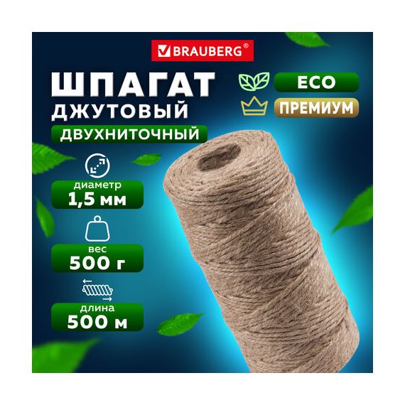Шпагат джутовый упаковочный полированный, длина 500 м, диаметр 1,5 мм, 1200 текс, BRAUBERG