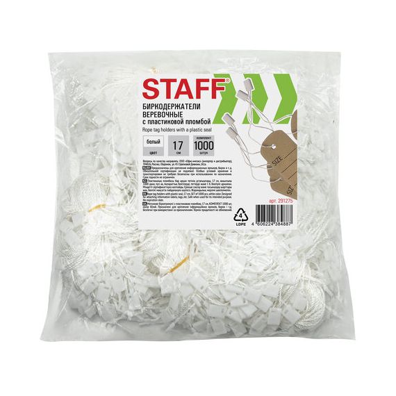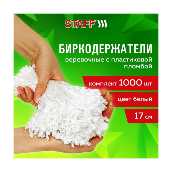 Биркодержатели веревочные с пластиковой пломбой 17 см, STAFF, КОМПЛЕКТ 1000 штук, белые, 291275