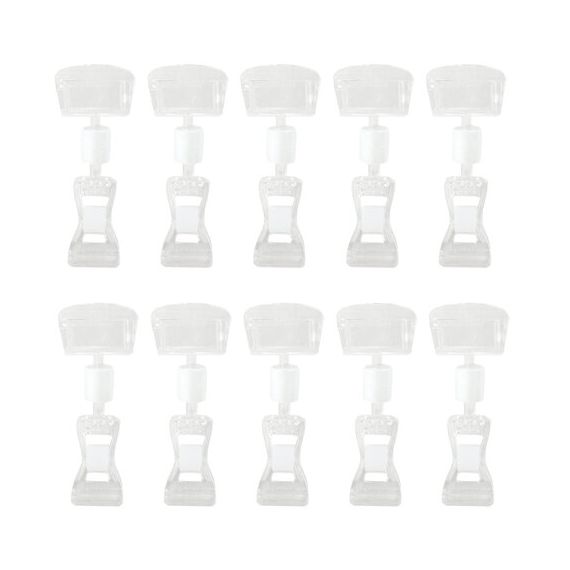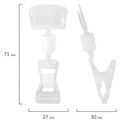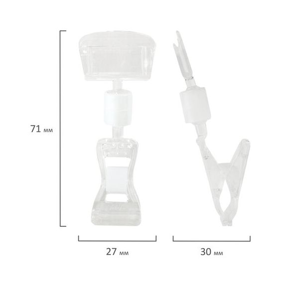 Держатели-прищепки изготовлены из поликарбоната. Он прочный, легкий, оптически прозрачный, пластичный, морозостойкий и очень долговечный. Держатель-прищепка имеет размеры 71х27х30 мм. Максимальная толщина вставки составляет 3 мм. 10 штук в комплекте.