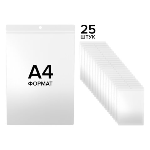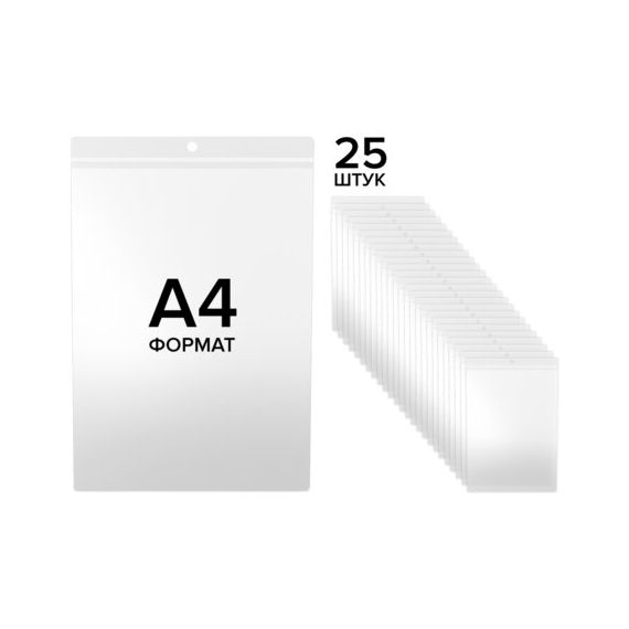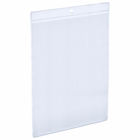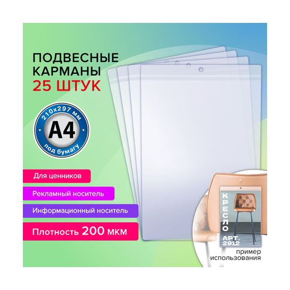 Карман имеет круглое отверстие для подвешивания ценника при помощи нейлоновых хомутов или веревочных биркодержателей. Предусматривает двустороннее размещение с верхней стороны. Формат: А4. Материал изготовления: мягкий ПВХ. Размер одного кармана - 21,7х30,5х0,1 см. Единица продажи - 25 шт., упакованы в пакет с липким краем.