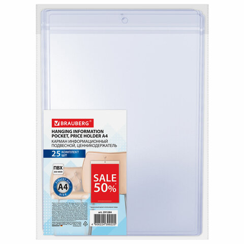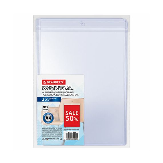 Карман информационный подвесной, ценникодержатель А4, КОМПЛЕКТ 25 шт., ПВХ, BRAUBERG, 291284