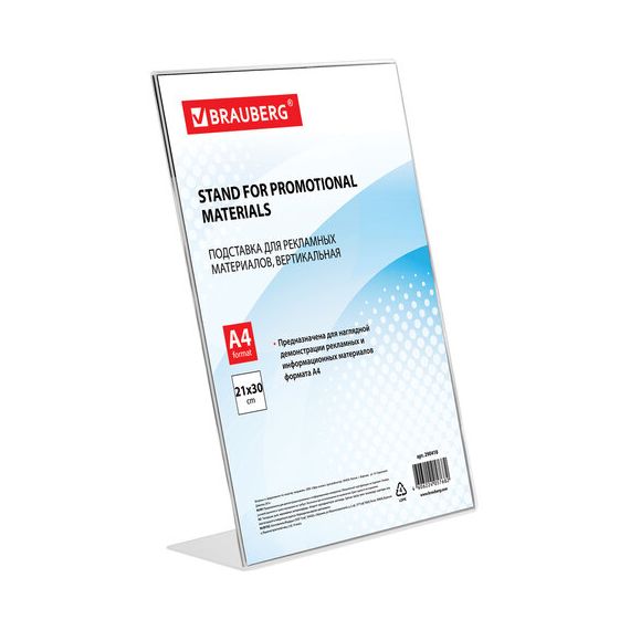 Односторонняя вертикальная настольная подставка BRAUBERG подходит для размещения меню, рекламных материалов формата А4.